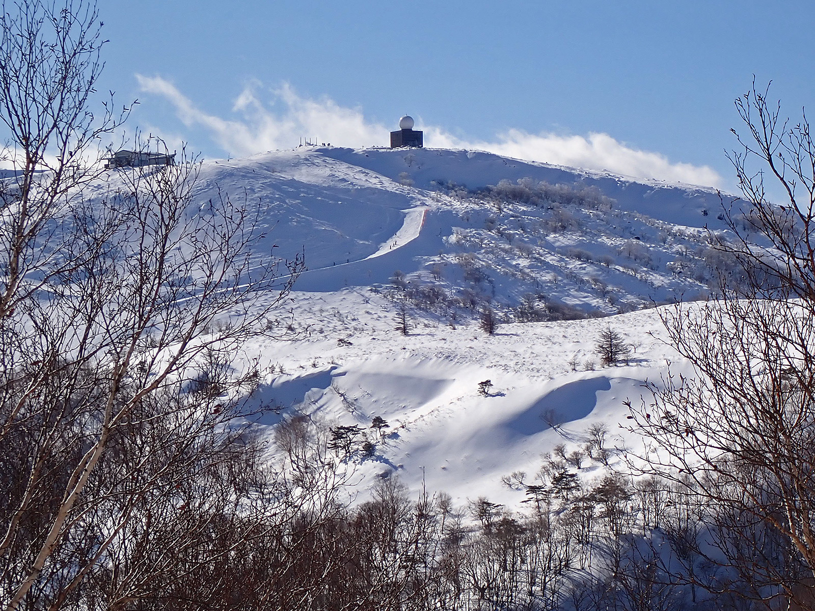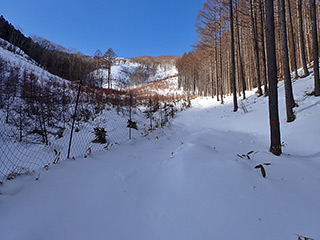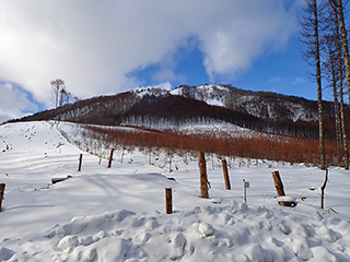 正面の斜面。以前はここを滑ったこともありますが、今は周囲に柵が設けられています。柵の外の樹林帯は昨年滑りました。