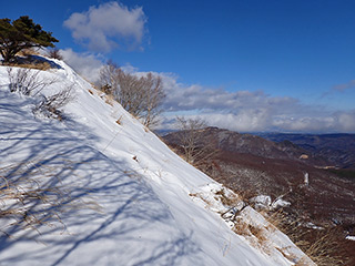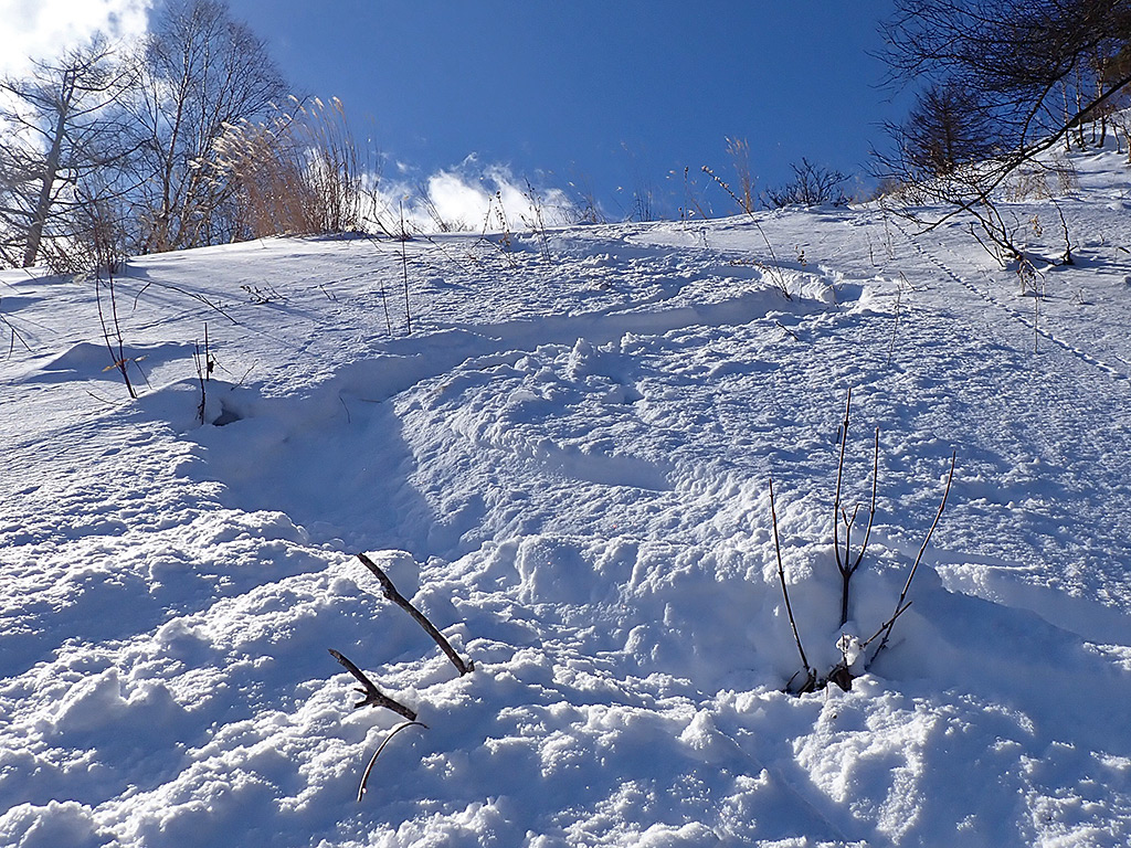 でもその先の急斜面はさすが殿城山、50cmほどの雪が吹き溜まっていました。