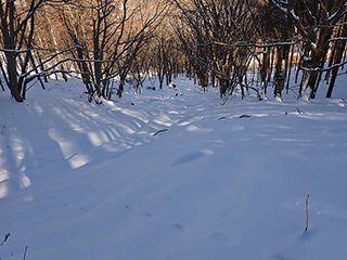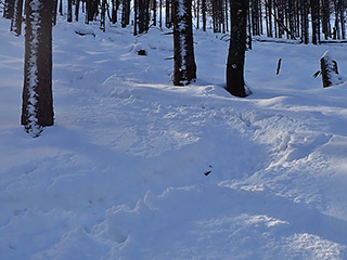 林に入ると雪が急に増えます。一面30cmほどかな。