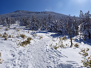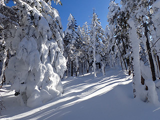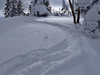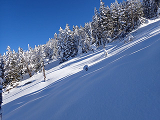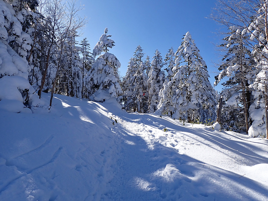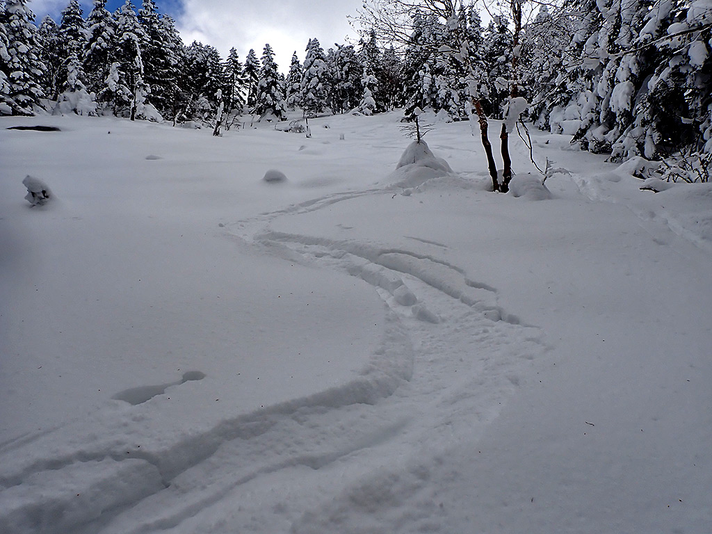 登山道を横切り、その先のゲレンデまで滑り降りて行きますが、吹き溜まりを滑れば20cmほどのパウダーで気持ち良かったです。
