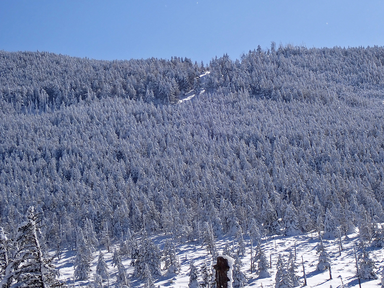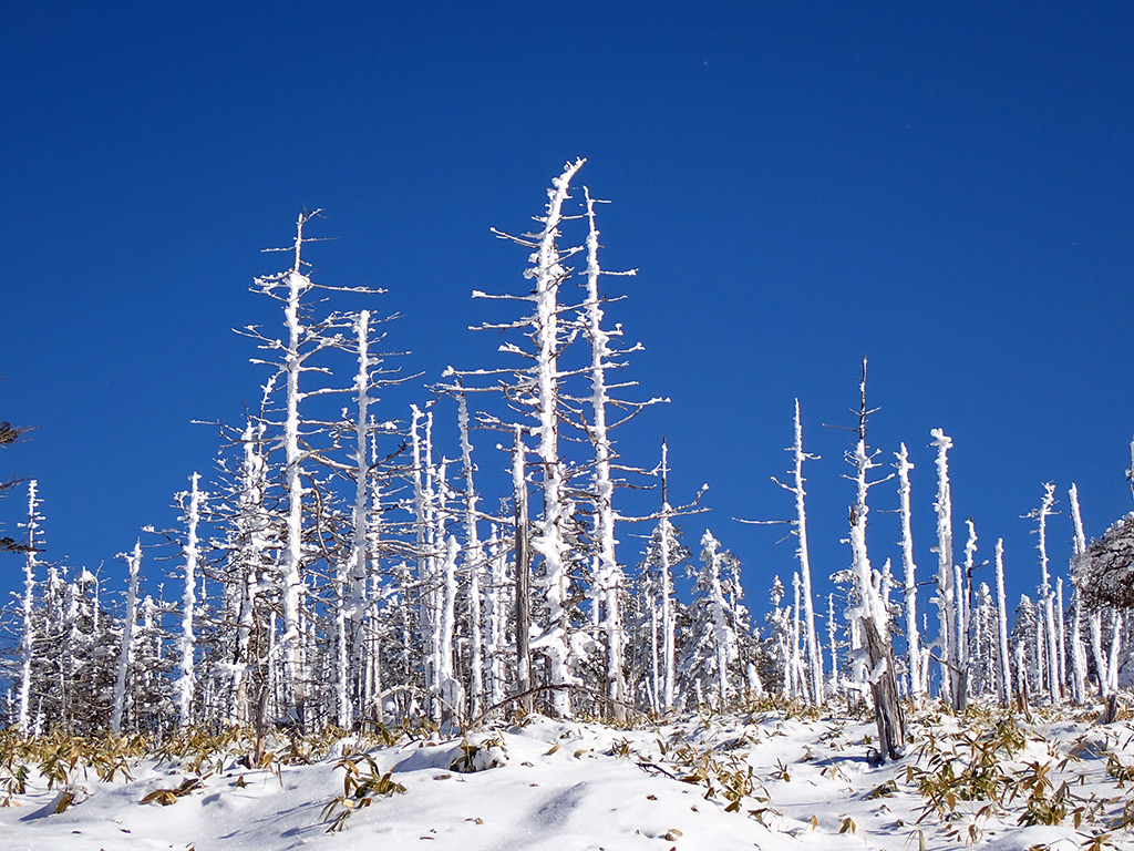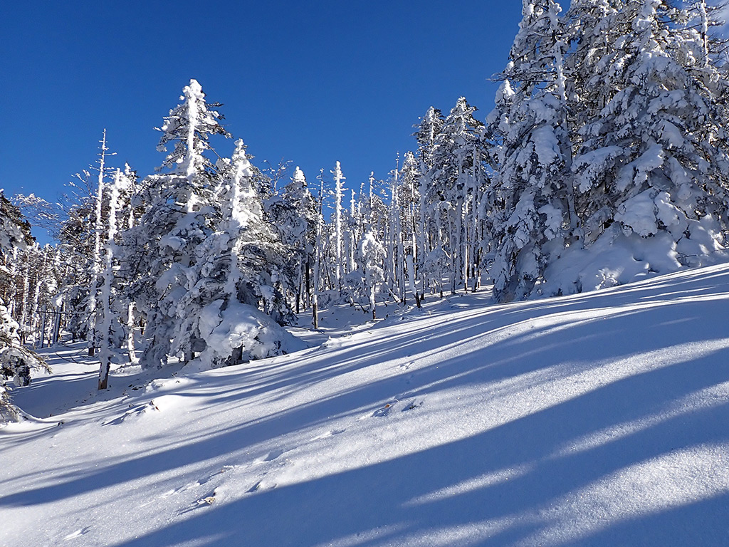 オープンバーンはここまで。その向こうは縞枯山山頂のあたり。