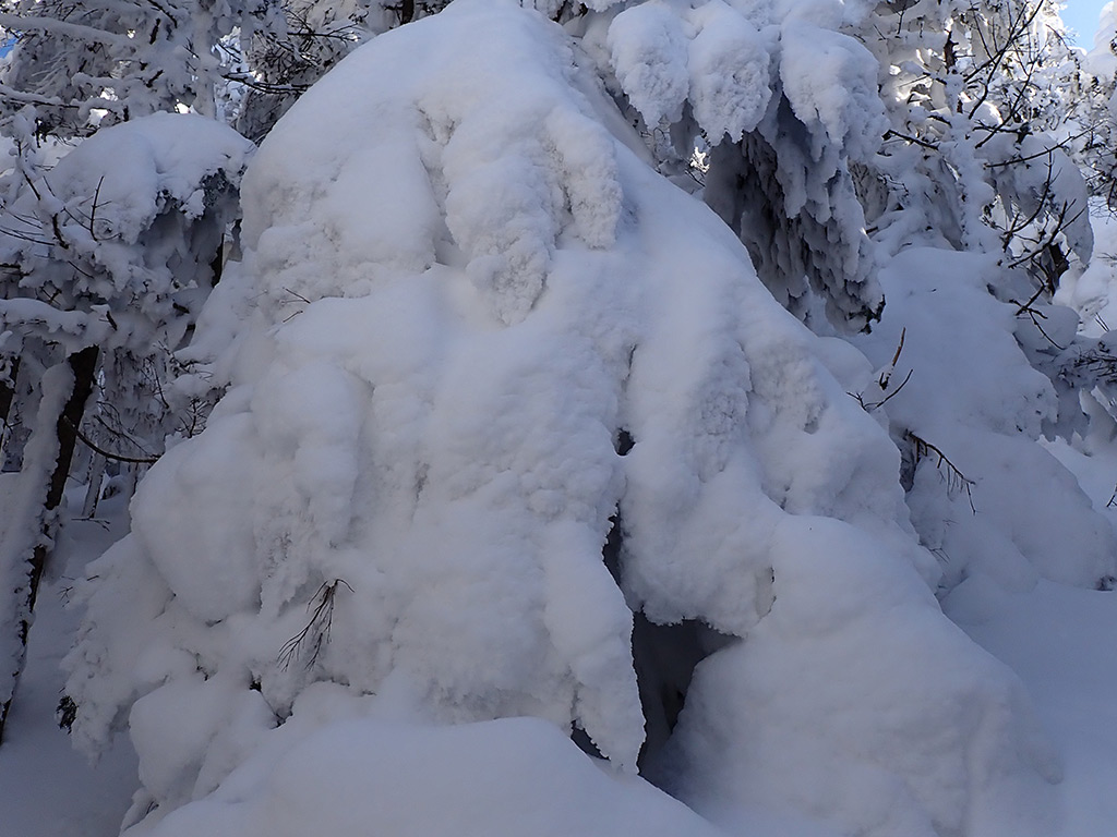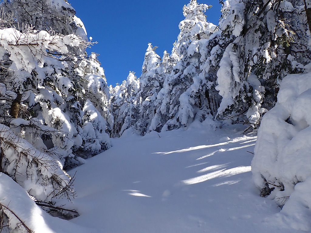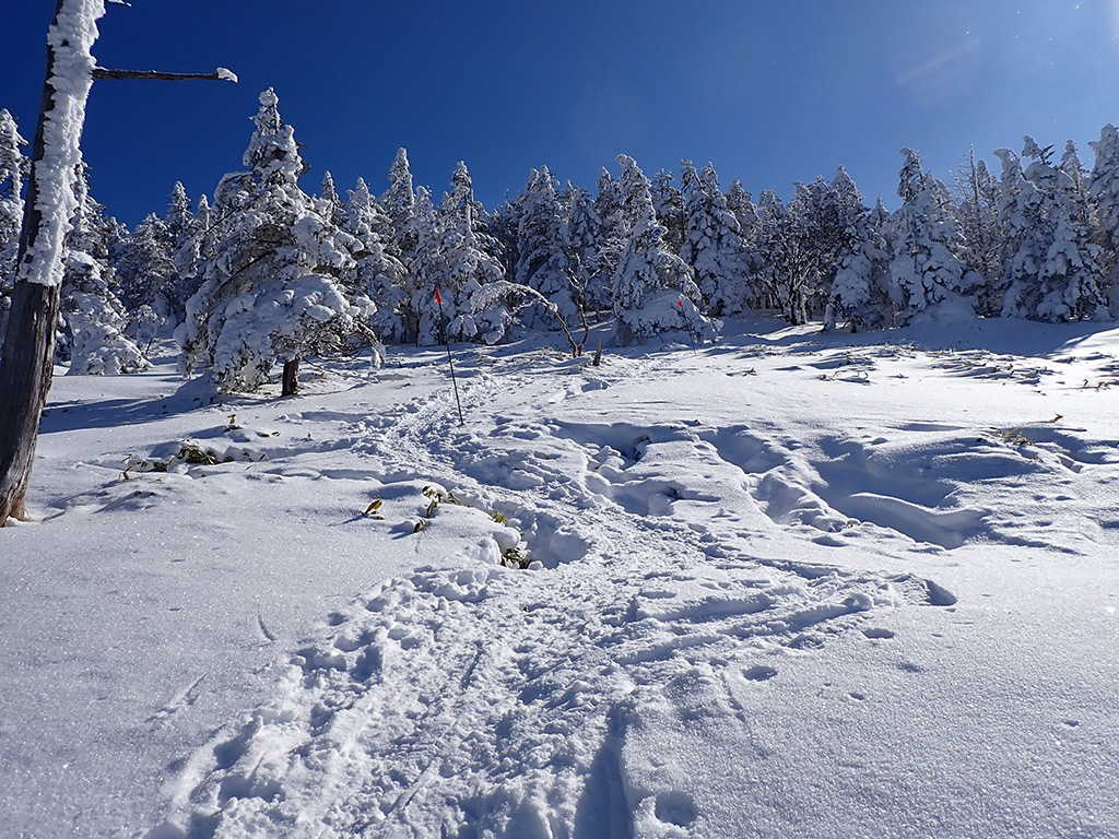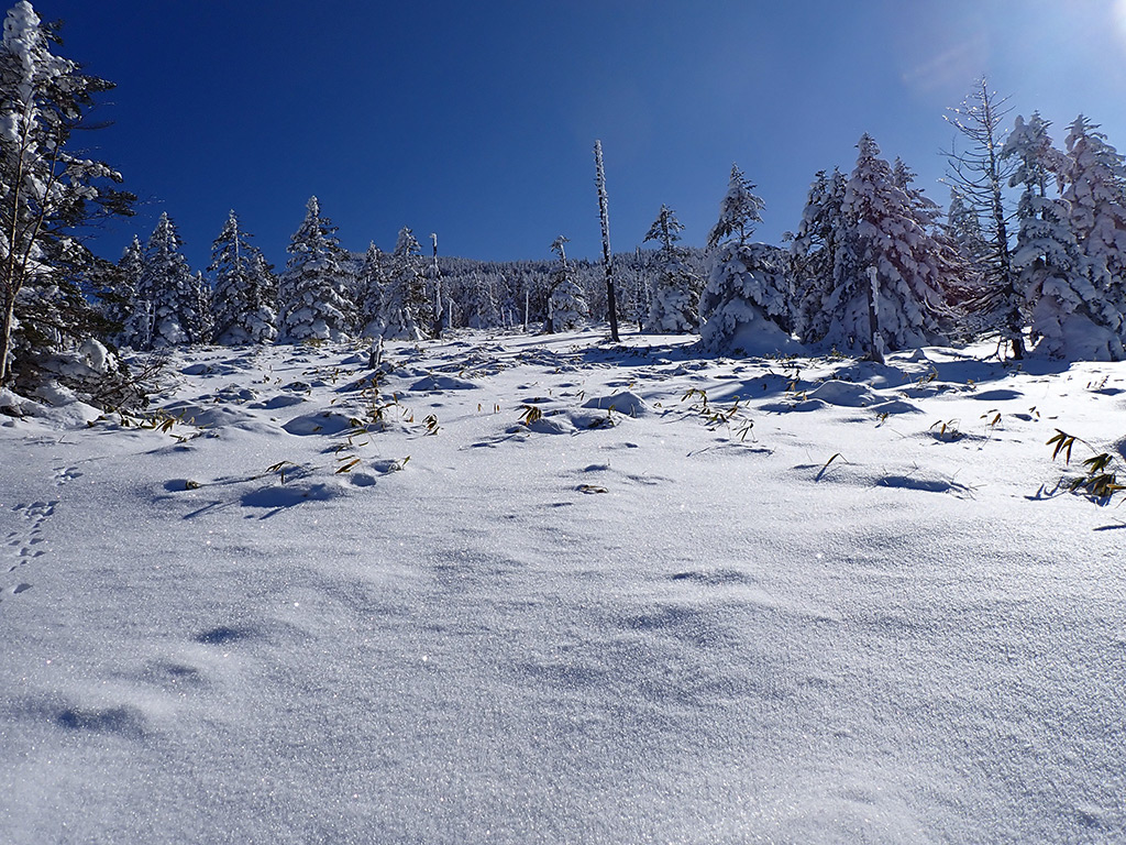 吹き溜まりはかなり真っ白。ただその先は少し笹が目立ちます。笹が顔を出しているところはほぼ踏み抜き地獄(^^;。