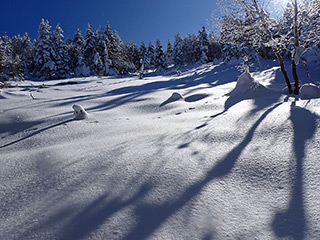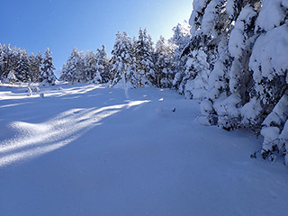 吹き溜まりをたどって滑り降ります。日当たりが良い斜面なので、雪質はあまり期待していませんでしたが、普通に柔らかい雪でした。やはりそれだけ冷え込んでいると言うことなのでしょう。