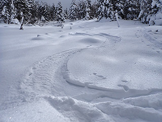 おお、ここは雪が吹き溜まっていますね。帰りはこのラインを滑り降りてきました。