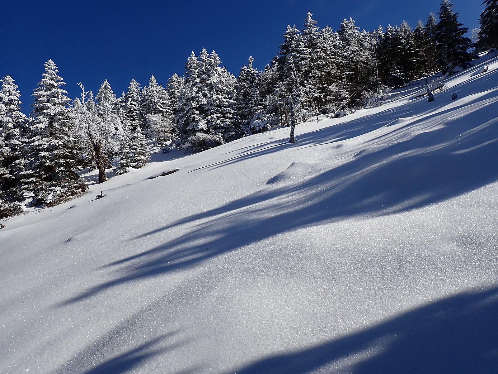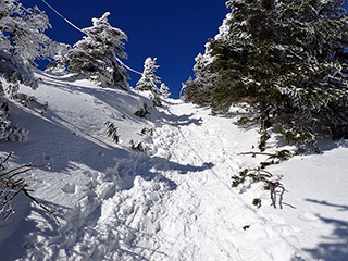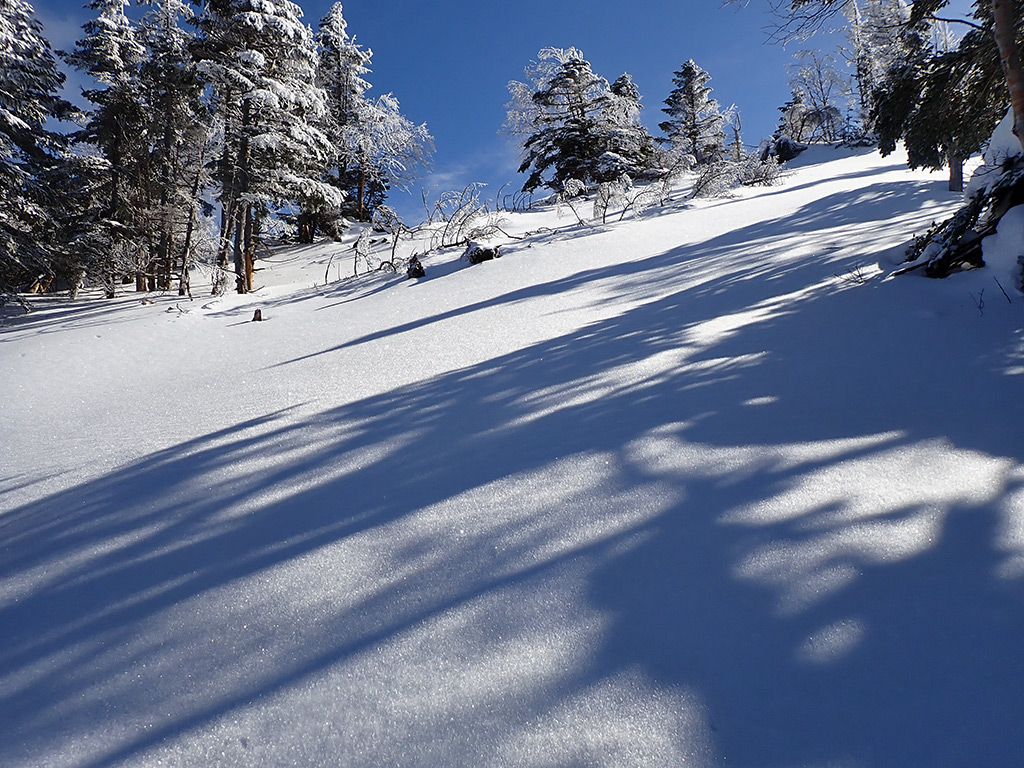 斜度はこれくらい。登っている時は常に15〜20cmほどのラッセルでした。雪はもっさりですが、表面は一昨日?の降雪で比較的さらさら。
