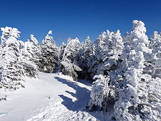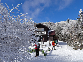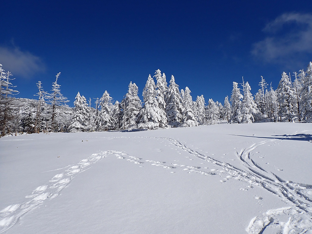 麓から見える北横岳の稜線が真っ白でしたので、ミニモンスターが楽しめそうと思い出かけて来ました。雪は少し前の湿った大雪(雨だったのかも?)と最近のさらさらの降雪でどんな状況か分からず、滑れそうになかったら登山後はゲレンデを滑り降りようと思っていたのですが、斜面の雪は良さそうに見えましたので、登山後に縞枯山にBCに出かけて来ました。