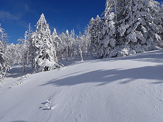 スノーシュールートは森に沿って進んだ後下っていきますので、そこからスノーシュールートを外れて森にトラバース気味に進みます。この辺りから笹は埋まり、スキーで上り下りとも問題ありません。