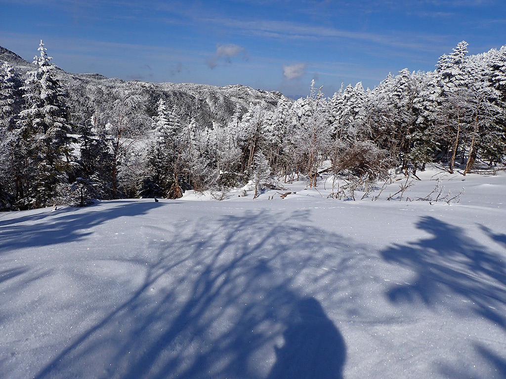 12時59分、オープンバーンはここまで。その向こうが縞枯山の稜線。